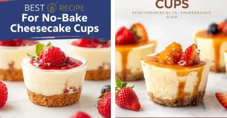 - Overlay text like “No-Bake Cheesecake Cups” or “Easy Mini Cheesecake Cups” on the image.